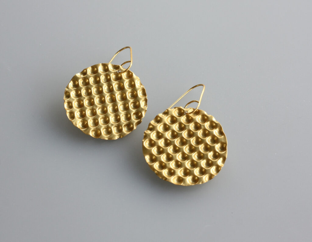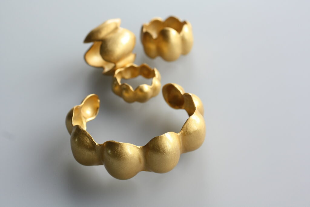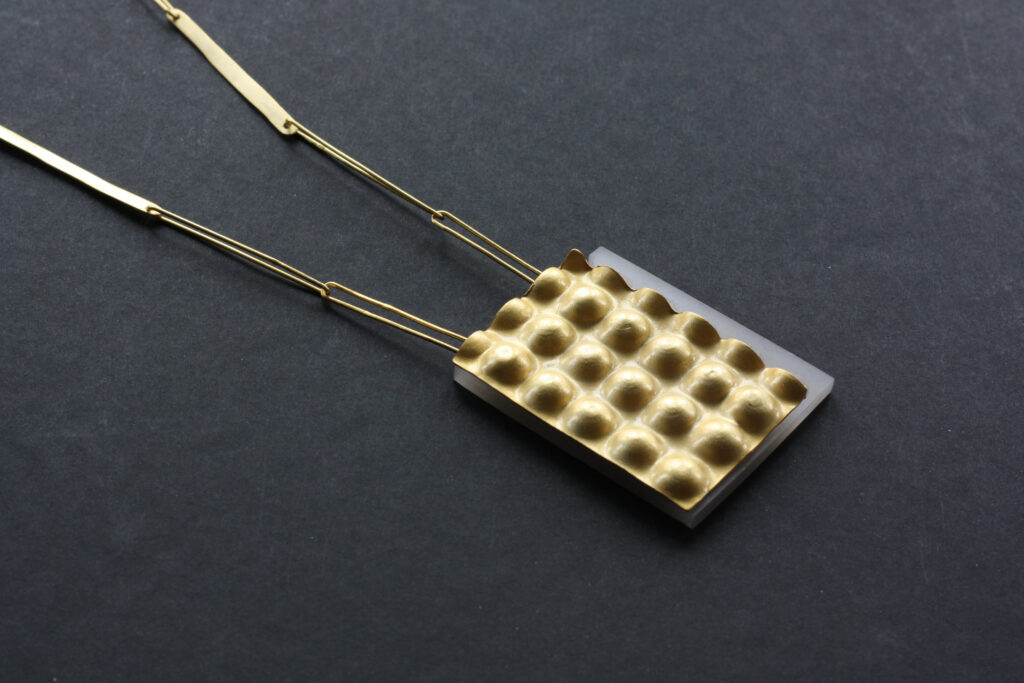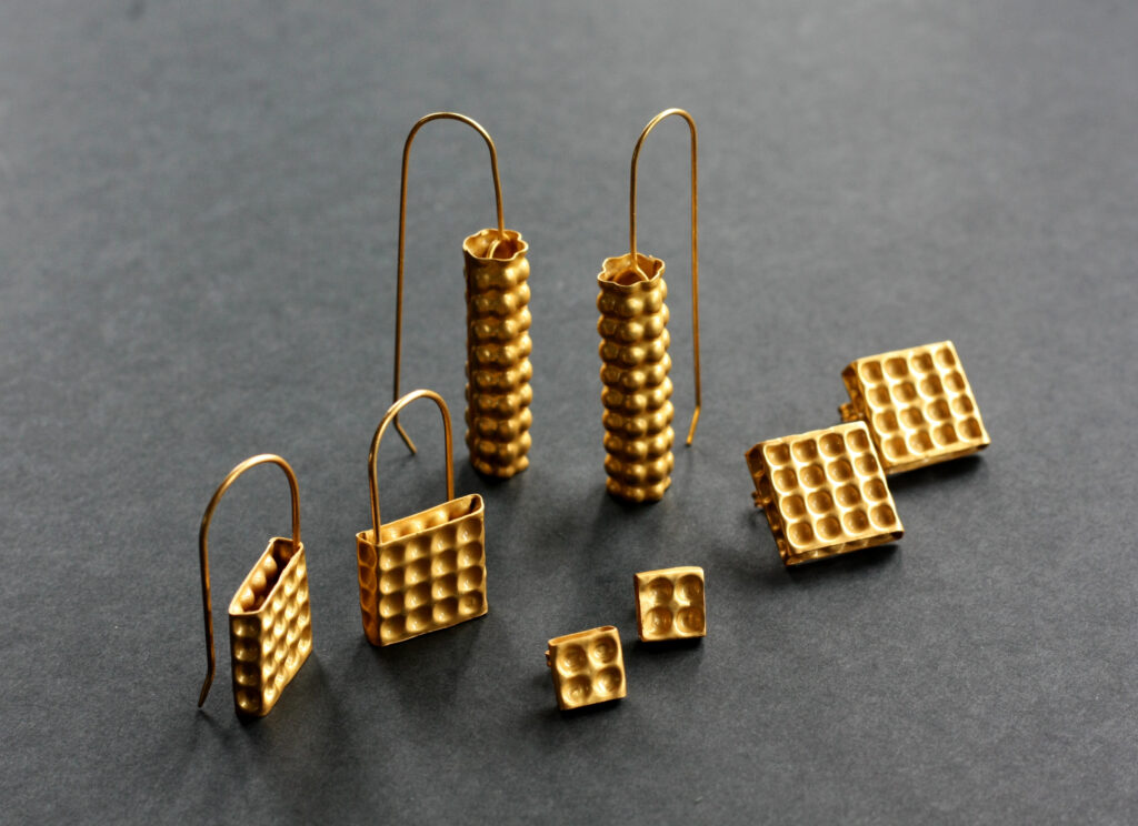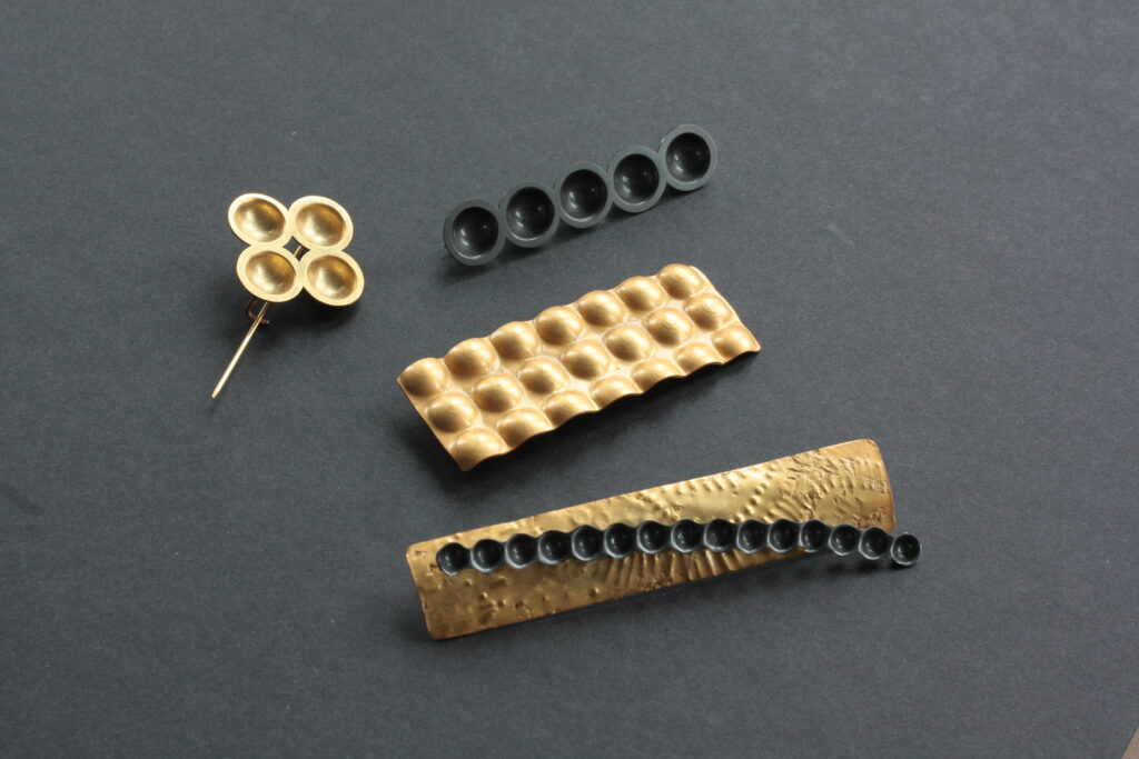 Kolekce šperků Topografia volně navazuje na můj předchozí výstavní projekt inspirovaný povrchovými útvary na povrchu Země, který jsem prezentoval na Romanian Jewellery Weeku v Bukurešti v roce 2023. Postupně jsem tento projekt rozpracoval do produkční podoby, která má podobné konotace, ale je více geometrická. Všechny šperky jsou klasicky řemeslně zpracované tepáním a pájením a nabízím je zpravidla ve třech verzích, v pozlacené nebo rutheniované mosazi a ve stříbře. Zlacené a rutheniované mají kartáčovaný povrch a stříbrná varianta šperků je naopak leštěná.